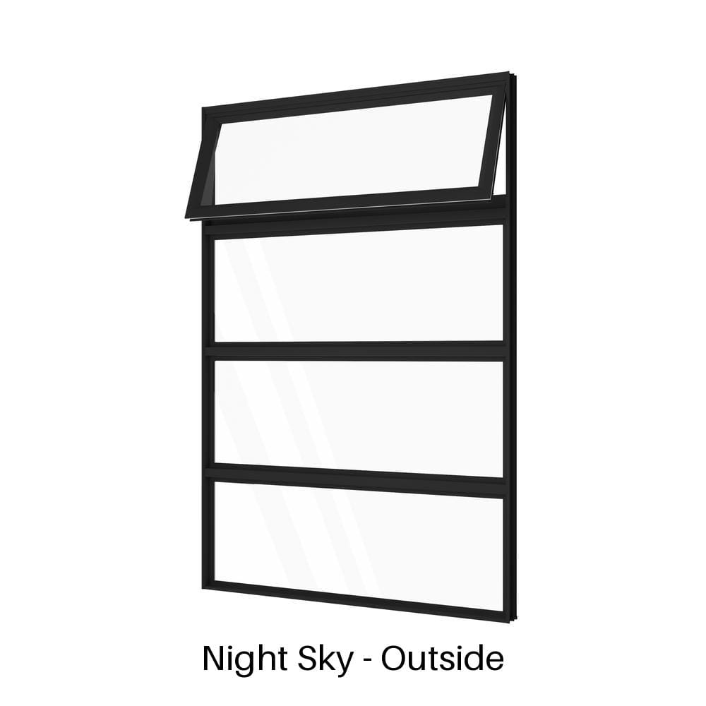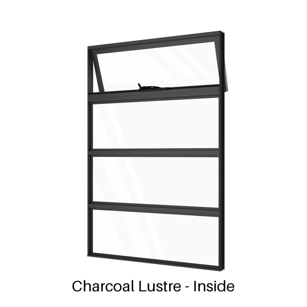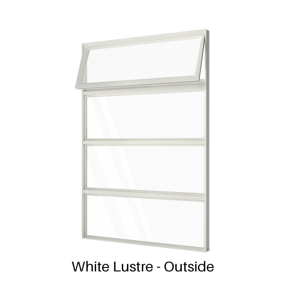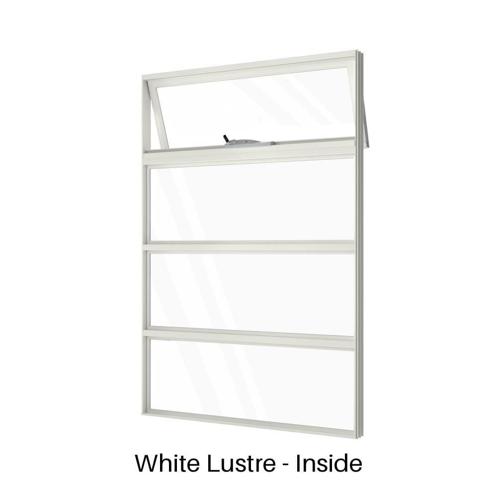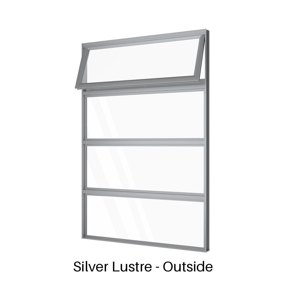 At the top, a single operable awning opens outward to admit fresh air, even in light rain. Beneath that are three evenly spaced fixed glass panels that brighten the room while keeping the lower sections secure. This awning window with low lites suits bathrooms, stairwells, kitchens, or anywhere wall height can be maximised—custom window sizes and colours are also available on request to accommodate unique layouts and design preferences.