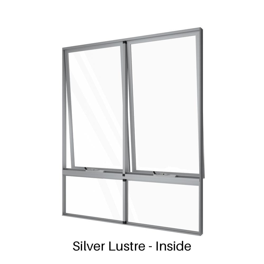 The top section features two aluminium awning windows—one on each side—both opening outwards for controlled airflow. Below are two fixed panes (low lites) that allow natural light in while maintaining a solid base to the window frame. The combination suits living areas, kitchen splashbacks, or bedrooms where a balance of air and structure is key.