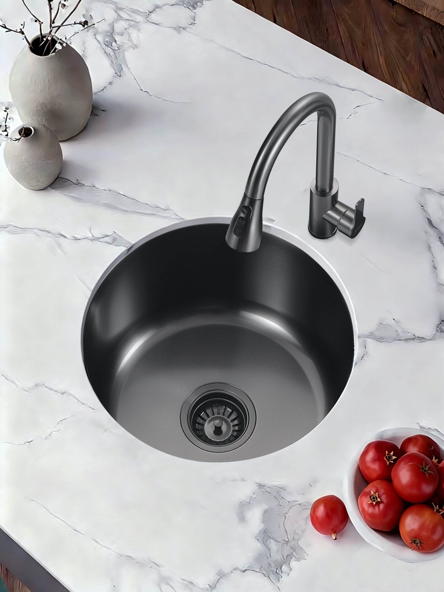 Crafted from 304 stainless steel, this round gunmetal sink resists rust, corrosion, and everyday wear. It handles constant washing, food prep, and cleaning products without degrading over time. The brushed finish reduces visible fingerprints and fine scratches, keeping the surface looking tidy with less effort.
